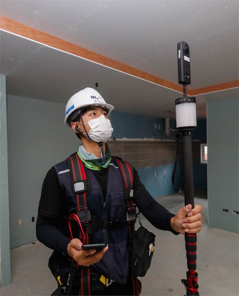 DL이앤씨 직원이 360도 카메라를 활용해 공동주택 건설현장 내부를 촬영하고 있다. (사진=DL이앤씨)