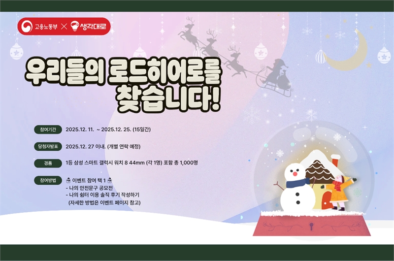 국내 대표 배달대행 플랫폼 브랜드 '생각대로'를 운영하는 ㈜로지올(대표이사 채헌진)은 고용노동부 (노무제공자지원과)와 '취약노동자 일터개선 지원사업' 일환으로 오는 25일까지 '이동노동자 쉼터 X 우리들의 로드 히어로' 온라인 공익 이벤트를 진행한다고 16일 밝혔다. 이번 캠페인은 추운 겨울에도 도로 위에서 시민들의 이