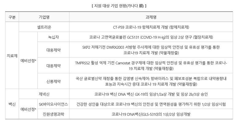 정부가 지원하는 코로나19 관련 약물 개발 과제 목록(자료=보건복지부)