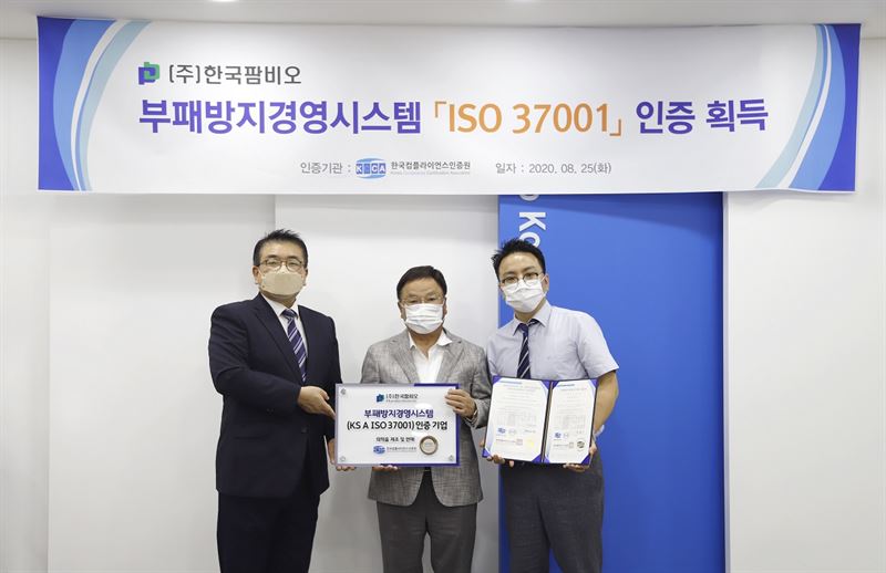 한국팜비오는 한국컴플라이언스인증원(KCCA)으로부터 부패방지경영시스템 국제표준 ‘ISO 37001’ 인증을 획득했다고 26일 밝혔다.