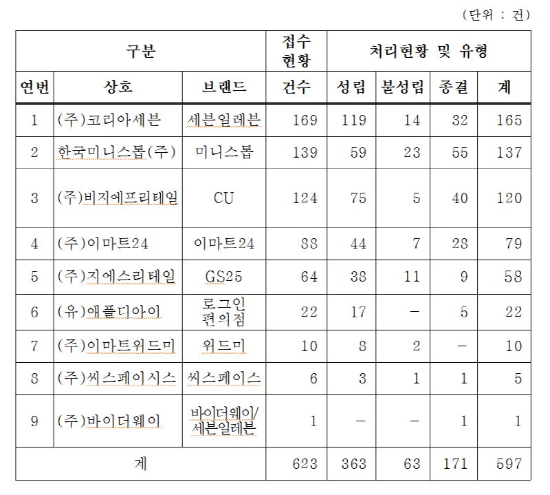 업체별 분석결과 코리아세븐이 운영하는 세븐일레븐의 분쟁조정 접수 건수가 2016년부터 올해 9월까지 169건으로 가장 많았다. 이어 미니스톱이 139건으로 두 번째로 많았고 CU 124건, 이마트24 88건 등 순이다.