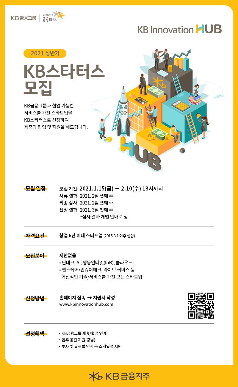 KB금융그룹(회장 윤종규)이 혁신적인 금융 서비스 확산에 함께 도전할 스타트업인 'KB스타터스'를 공개 모집한다. 창업 6년 이내 스타트업이라면 KB금융그룹의 핀테크랩인 KB이노베이션허브 웹사이트를 통해 2월 10일까지 온라인으로 신청하면 된다.