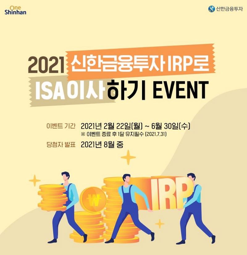 이번 이벤트는 6월30일까지 진행되며 당사/타사 ISA에서 신한금융투자 IRP계좌로 이전한 고객 대상 금액에 따라 추첨을 통해 이사축하금을 지급한다