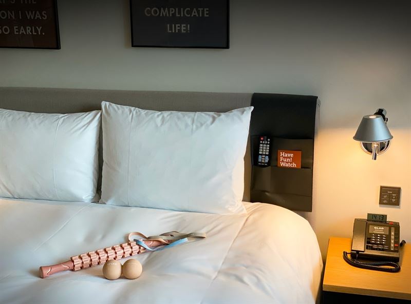 서울과 제주 글래드 호텔에서 이용 가능한 ‘홈트? 룸트!’ 패키지는 객실 1박에 ‘글래드x안다르 홈트 용품’ 3종이 포함됐다. 홈트 용품은 릴렉스 마사지 듀얼볼과 릴렉스 마사지 스틱, 엘라스틱 헤어밴드로 구성했다.