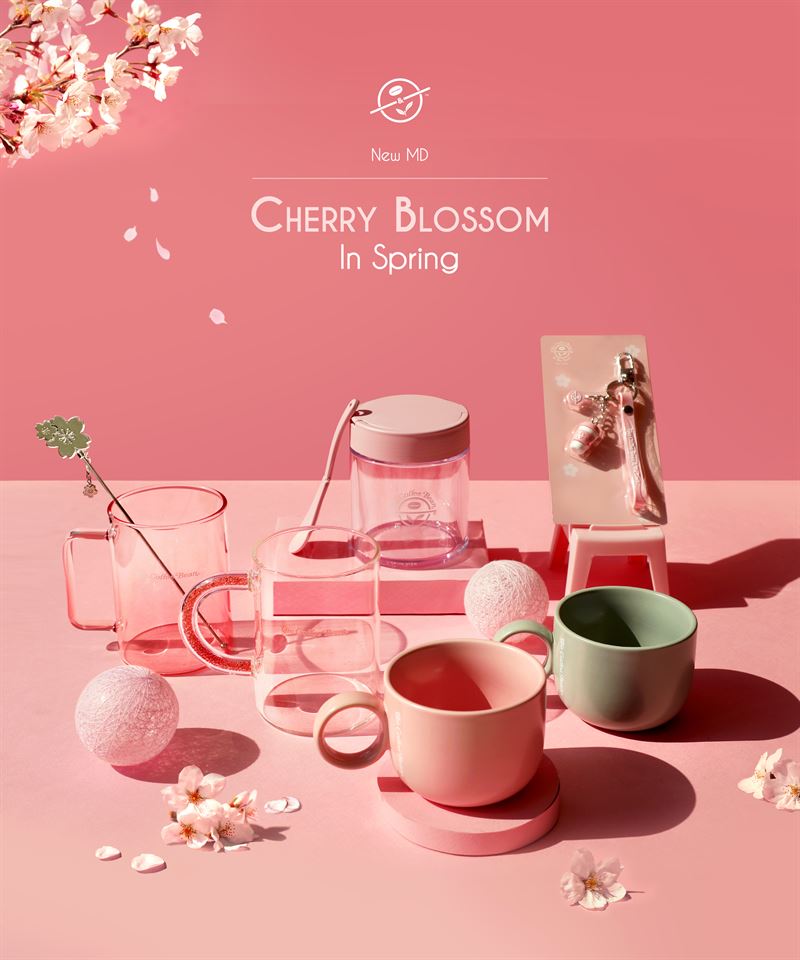 커피빈이 선보이는 벚꽃 에디션 제품으로는 ▲핑크 그라데이션 글라스 머그 ▲샤이닝 핸들 글라스 머그(핑크) ▲서클 머그(핑크/그레이그린) ▲피크닉 스푼 캐니스터 ▲벚꽃 머들러가 있다.