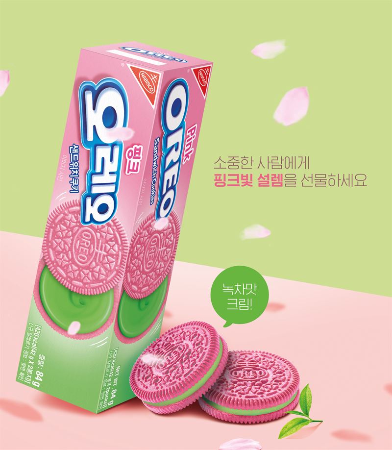 ‘오레오 핑크’는 봄 한정판인 만큼 봄과 어울리는 색깔과 맛을 지닌 상품으로, 천연색소를 사용해 핑크색을 내는 오레오 쿠키 내 달콤하고 부드러운 녹차 크림을 얹힌 것이 특징이다.