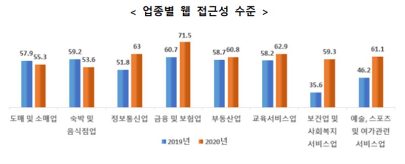 업종별로는 '금융 및 보험업'과 '정보통신업' 분야의 웹 접근성 수준이 상대적으로 양호하다. '도매 및 소매업'과 '숙박 및 음식점업' 분야의 웹 접근성은 비교적 낮은 편으로 나타났다. 사업체 규모별로는 연매출액이 크고 종사자 수가 많은 사업체일수록 상대적으로 웹 접근성 수준이 높은 것으로 나타났다.