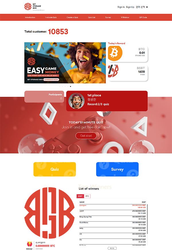 이러한 배경에서 비트스토리지박스(BitStorageBox, 이하 BSB) 플랫폼은 다양한 영역을 주제로 우리가 알고 있는 지식과 상식, 알고 싶은 것, 알리고 싶은 것을 누구나 자유롭게 퀴즈나 설문으로 만들어 등록하고 광고 수익을 창출할 수 있어 관심을 모은다.