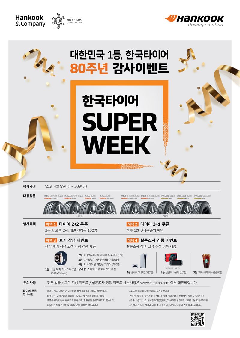 한국타이어가 창립 80주년을 기념해 오는 30일까지 ‘한국타이어 슈퍼위크’ 프로모션을 진행한다고 9일 밝혔다.