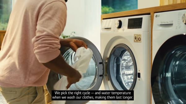 옷을 오래 입을 수 있도록 세탁기와 건조기로 잘 관리하면 폐의류로 인한 환경오염과 자원낭비를 줄이고 세상을 바꿀 수 있음을 보여주는 영상 속 장면 (사진=LG전자)