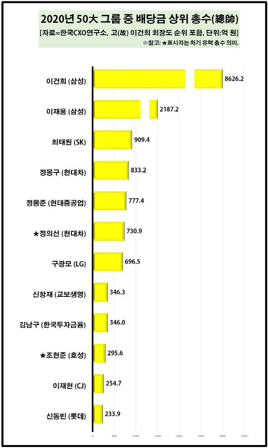 지난해 '그룹 총수 배당금 톱10'에는 6위 현대차 정의선 회장(730억원, 4.1%), 7위 LG 구광모 회장(696억원, 3.9%), 8위 교보생명보험 신창재 회장(346억2700만원, 1.9%), 9위 한국투자금융 김남구 회장(346억390만원, 1.9%), 10위 효성 조현준 회장(295억원, 1.7%) 순으로 이름을 올렸다.