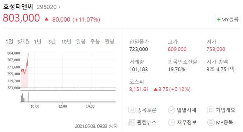 한국거래소에 따르면 효성티앤씨는 3일 오전 9시 33분 현재 11.07% 오른 80만3000원으로 거래되고 있다.