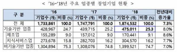 이번 조사 결과에 따르면 2018년 기준 창업기업은 187만5000개로 전년(174만8000개)보다 12만7000개(7.3%) 증가했다. 특히 4차 산업혁명 핵심기술 적용과 활용범위 확산 영향으로 기술기반업종이 47만5000개로 전년 대비 3만5000개(8.0%) 늘었다.