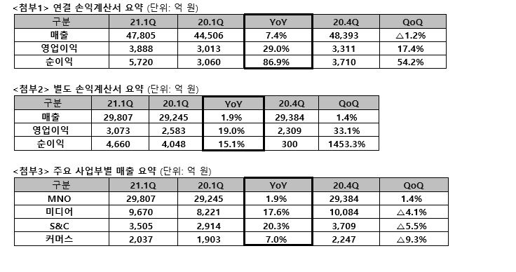 SK텔레콤은 2021년 1분기 매출 4조 7805억 원, 영업이익 3888억 원, 순이익 5720억 원의 실적을 기록했다. 전년 동기에 비해 매출과 영업이익은 각각 7.4%, 29% 증가한 수준이다. 미디어·보안·커머스 등 뉴 ICT 사업이 성장을 견인했다는 입장이다.