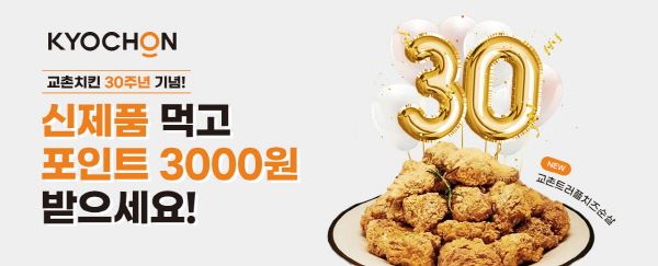 교촌치킨이 이달 31일까지 자체 주문앱에서 신메뉴 ‘교촌치즈트러플순살’을 주문한 고객을 대상으로 3000 포인트 적립 프로모션을 진행한다.