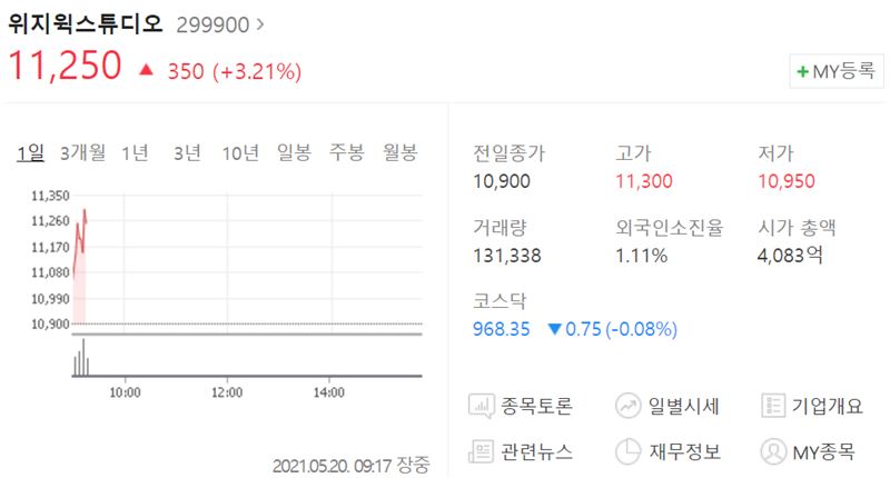 한국거래소에 따르면 위지윅스튜디오는 20일 오전 9시 17분 현재 3.21% 오른 1만1250원에 거래 중이다.
