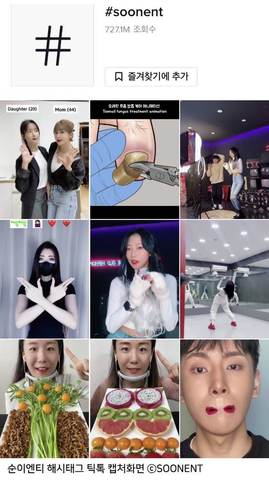 틱톡 공식 MCN이며 유튜브와 인스타그램 등 다양한 온라인 미디어 창작자, 온라인 콘텐츠 메이커로 불리는 틱톡커와 인플루언서를 전속으로 매니지먼트하며 활발히 활동중인 순이엔티의 전속 인플루언서들은 영상 콘텐츠를 게시 할 때 멘션에 “#SOONENT” 를 작성하고 있다.