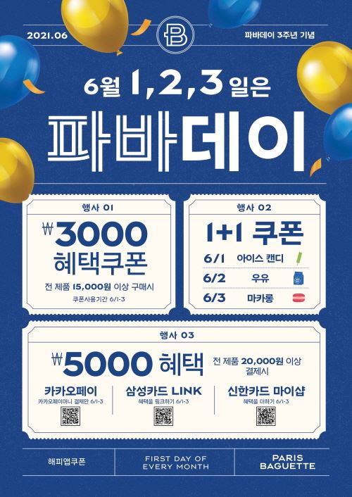 6월 1일에는 ‘아이스 캔디’, 2일 ‘우유’, 3일 ‘마카롱’ 순으로 진행되며 쿠폰은 해피앱과 파리바게뜨 공식 카카오톡 플러스친구를 통해 선착순으로 다운로드 가능하다.