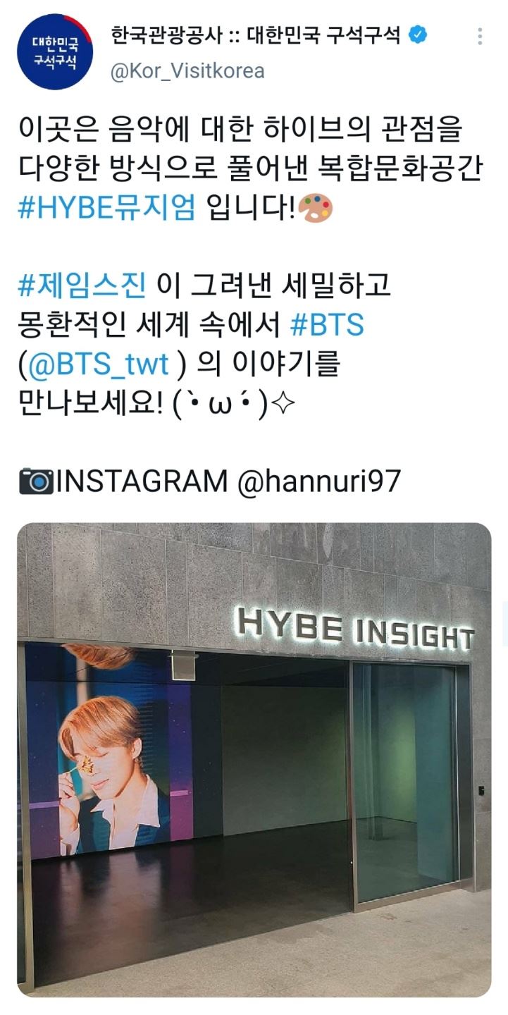 한국관광공사는 지난 1일 공식 트위터를 통해 지민의 사진을 대표로 하이브의 음악 뮤지엄인 '하이브 인사이트'(HYBE INSIGHT)를 소개했다. '하이브 인사이트'는 아티스트와 팬이 음악을 매개로 만나는 복합 문화공간으로, 방탄소년단을 비롯한 하이브 소속 뮤지션들의 음악적 역사를 만나볼 수 있다.