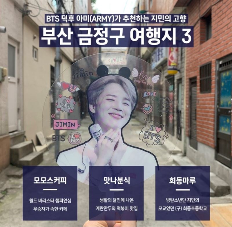 앞서 부산관광공사는 '부산 가볼 만한 곳, BTS 덕후 아미(ARMY: 팬덤명)가 추천하는 지민의 고향 부산 금정구 여행지 3'을 제목으로 지민과 관련한 명소를 소개해 팬덤뿐 아니라 국내외 관광객들로부터 큰 호응을 얻은 바 있다.