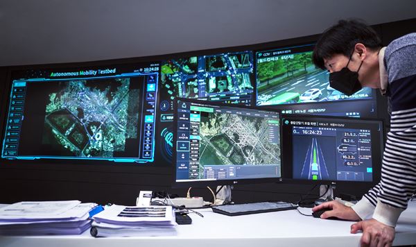 ‘서울 미래 모빌리티 센터 관제실’에서 ‘C-ITS’를 점검하는 모습 (사진=SK텔레콤)