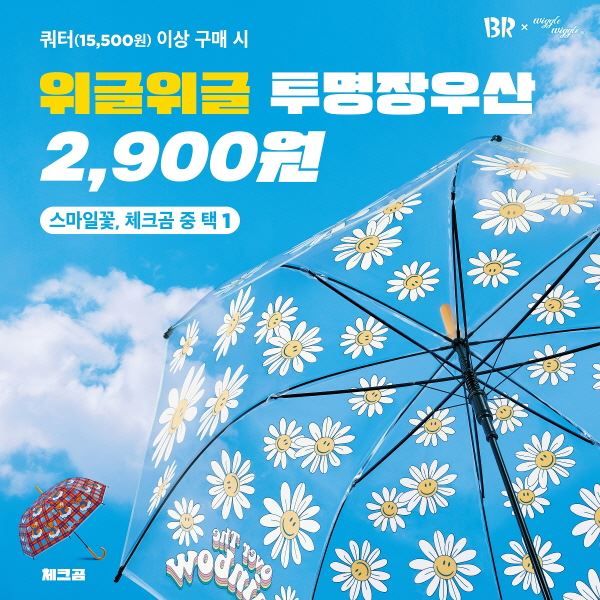 ‘위글위글 투명 장우산’은 다가오는 장마철 필수품인 장우산에 두가지 패턴의 디자인을 적용했다. 각각 활짝 웃는 데이지꽃 일러스트 ‘스마일 위 러브’와 브라운 체크와 배스킨라빈스 아이스크림을 즐기는 곰돌이 캐릭터를 그려 넣었다.