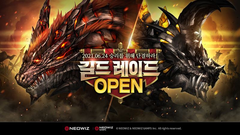 새롭게 선보이는 ‘길드 레이드’는 2주간의 시즌제로 운영되는 콘텐츠로 하루 2회 참여할 수 있으며 보스와의 전투에서 승리하면 다음 단계로 넘어간다. 화산, 사막 등 총 4종의 지역이 등장하며 길드 레이드 점수에 따른 순위와 전투 결과를 종합해 고대주화 및 슈타인잉크 등 아이템을 받을 수 있다.