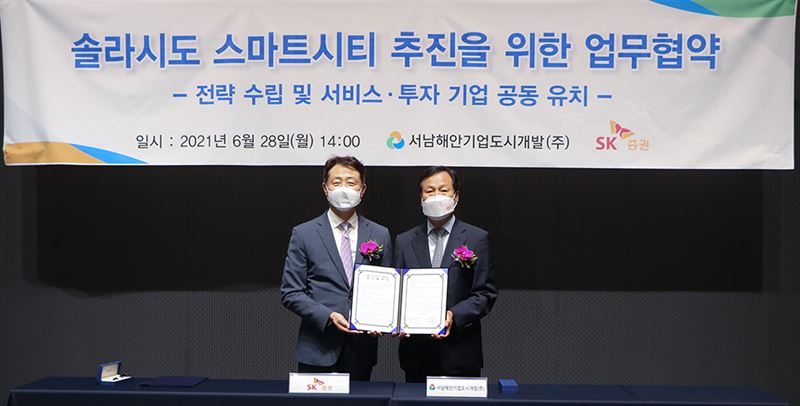솔라시도 사업시행사인 서남해안기업도시개발과 SK증권은 28일 한양타워에서 양사가 보유한 스마트 기술과 노하우를 기반으로 솔라시도의 스마트시티 개발에 적극적으로 협력키로 하고 세부사항을 담은 양해각서를 체결했다.
