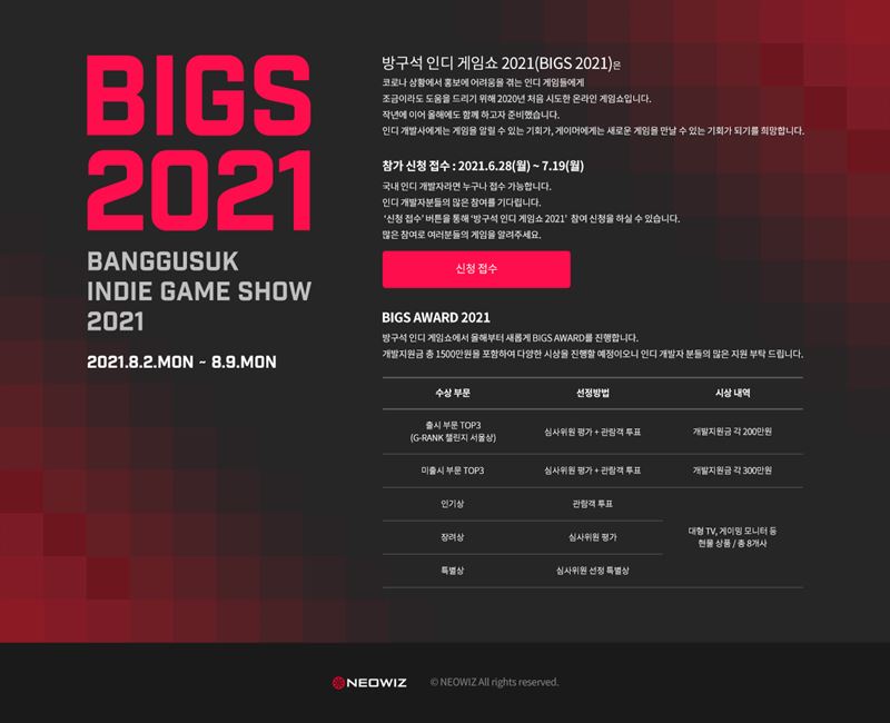 네오위즈는 국내 인디 게임 개발사들이 참가하는 ‘방구석 인디 게임쇼(BIGS: Banggusuk Indie Game Show)2021(이하 비익스 2021)’를 개최한다고 29일 밝혔다.