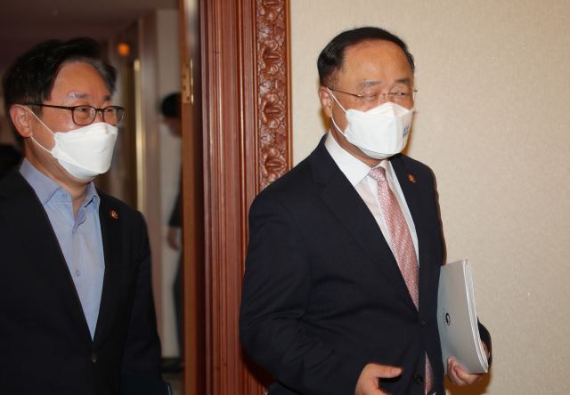 홍남기(오른쪽) 부총리 겸 기획재정부 장관과 박범계 법무부 장관이 1일 정부서울청사에서 열린 임시국무회의에 참석하고 있다(사진=연합뉴스)