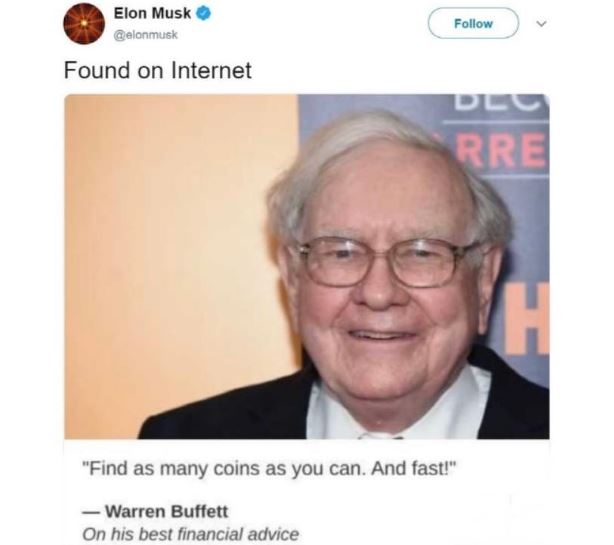 6일 (현지시간) 영국 인디펜던트는 머스크가 자신의 트위터에 버핏 회장 사진과 함께 “그의 최고 재정적 조언에 따라 가능한 많은 코인을 찾아라. 빨리!”라고 글을 적은 게시물을 게재했다고 보도했다.