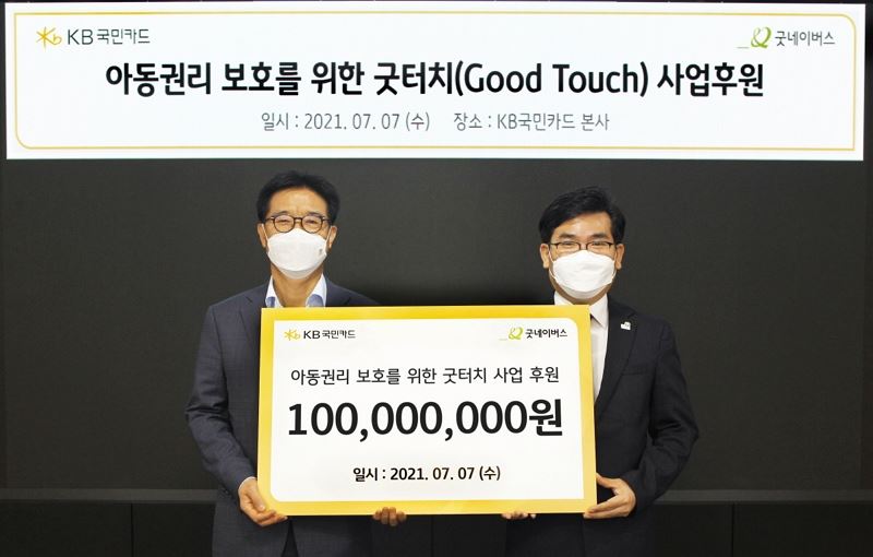 KB국민카드(사장 이동철)가 7일 서울 종로구 KB국민카드 본사에서 아동 권리 보호 사업인 ‘굿 터치(Good Touch)’ 지원을 위한 후원금 1억원을 사회복지법인 ‘굿네이버스’에 전달했다.