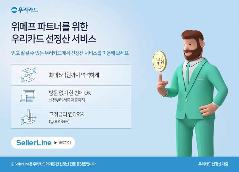 우리카드가 업계 최초로 온라인쇼핑몰 중소 셀러를 위한‘선정산 서비스’를 출시했다.