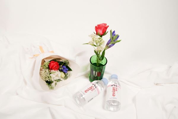 패키지는 프리미엄 생수 에비앙 330mL 페트병 2개와 꾸까의 전문 플로리스트가 엄선한 꽃다발, 버려진 와인병과 위스키병을 업사이클링해 만든 친환경 에비앙 꽃병으로 구성됐다.