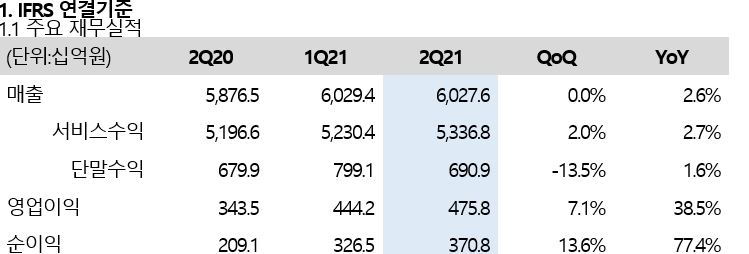 KT는 한국채택국제회계기준(K-IFRS) 2021년 2분기 연결기준 매출 6조276억원, 영업이익 4758억원을 기록했다고 10일 밝혔다. 전년 동기 대비 매출은 1511억원(2.6%), 영업이익은 1323억원(38..5%) 증가했다.