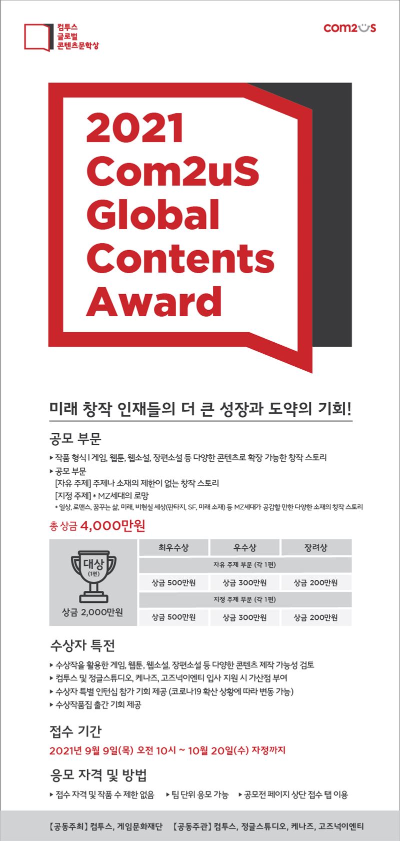 컴투스가 미래 게임 및 콘텐츠 시장을 이끌어갈 창작 인재들에게 성장과 도약의 기회를 제공하는 ’컴투스 글로벌 콘텐츠문학상 2021’를 개최한다고 19일 밝혔다.