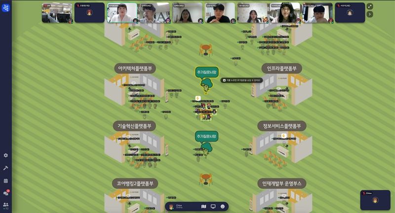 메타버스 공간의 연수 과정은 신입행원 각자가 자신의 개성을 나타낸 아바타를 통해 소통하고 학습에 참여할 수 있도록 설계했다. 특히 ‘선배와 대화존’ 에서는 본인이 근무를 지망하는 부서의 선배들과 질의응답을 통해 신입행원 연수기간 중 학습 방향과 은행 생활의 미래를 계획할 수 있다. 또한 ‘팀별 소모임존’을 통해 공동 프로젝트를 진행하는 등 게더타운의 양방향 의사소통이 수월한 장점을 활용했다.