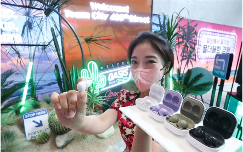 LG유플러스 모델이 서울 강남역에 위치한 복합문화공간 ‘일상비일상의틈’에서 갤럭시 버즈2를 소개하고 있다. (사진=LG유플러스)