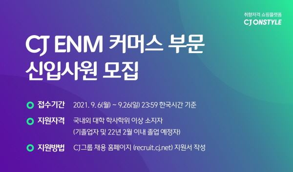 한편 CJ ENM 커머스부문 하반기 신입사원 모집 서류 접수는 9월 6일부터 26일까지 CJ그룹 채용 홈페이지(recruit.cj.net) 및 모바일 홈페이지를 통해 가능하다.