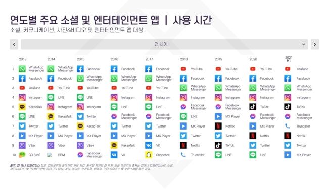 사용 시간 기준 연도별 주요 소셜 및 엔터테인먼트 앱 (자료=앱애니)