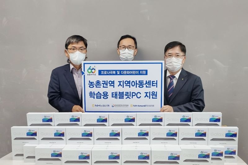 NH농협은행이 농촌지역 다문화어린이를 위한 온라인 학습용 태블릿PC 40대를 한국지역아동센터연합회에 전달했다.
