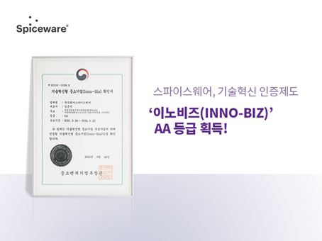 이노비즈 인증제도는 기술혁신능력, 기술사업화능력, 기술혁신경영능력, 기술혁신성과 4개 분야에 대한 기술혁신 시스템 평가를 거쳐 이뤄진다. 스파이스웨어는 전 분야에서 우수한 평가를 받아 최종 AA등급을 획득했다. 1000점 만점 중 800점 이상을 얻은 기업이 속하는 AA등급은 보유 기술이 관련분야 상위 5% 이내에 해당하는 경우에 부여된다.
