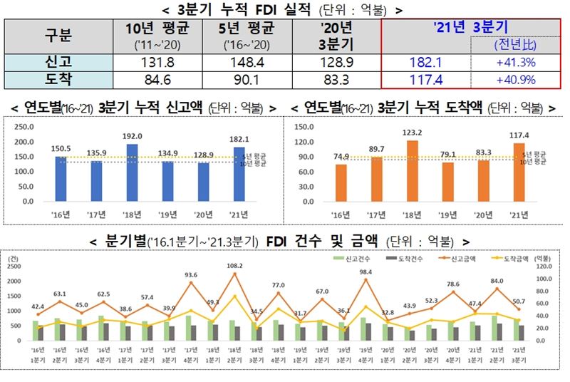 신고·도착 모두 3분기(누적) 역대 2위 실적을 기록하는 등 코로나19 이후 안정적 국내 기업환경에 대한 대외 신뢰가 굳건하다는 평가가 나온다.