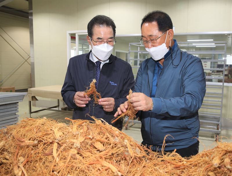 농협중앙회 이성희 회장(왼쪽)과 김포파주인삼농협 조재열 조합장이 8일 경기도 김포시에 위치한 인삼유통센터에서 수확된 인삼을 살펴보고 있다. (사진=농협중앙회)