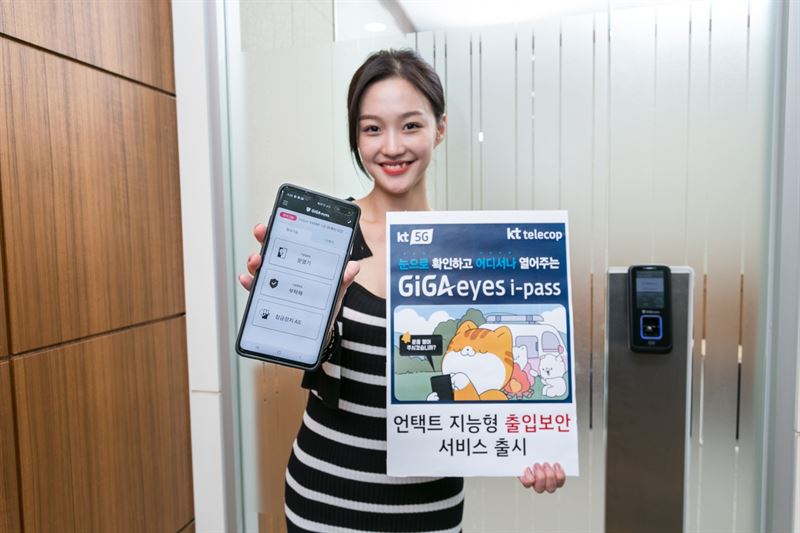 모델이 비대면 출입보안서비스 ‘기가아이즈 아이패스’의 출시를 소개하고 있다. (사진=KT텔레킵)