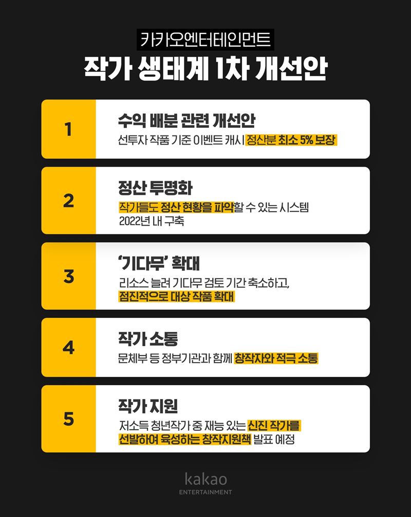 이번 발표를 시작으로 카카오엔터테인먼트는 창작자와 업계 관계자들의 다양한 의견을 수렴해 실질적인 개선안들을 지속적으로 추진해나갈 예정이다.