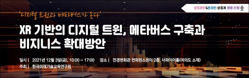 한국미래기술교육연구원은 오는 12월 3일 서울 여의도 전경련회관 사파이어홀에서 'XR(확장현실) 기반의 디지털 트윈, 메타버스 구축과 비지니스 확대방안' 세미나를 온·오프라인으로 병행해서 개최한다고 21일 밝혔다.