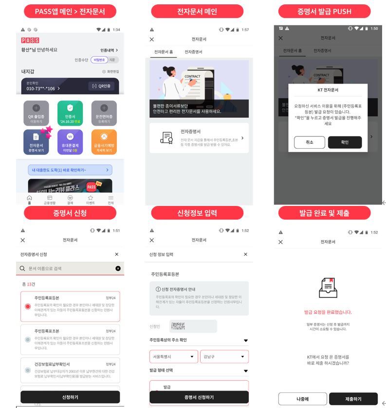 앞으로 KT 고객은 가족결합, 명의변경 등 서비스를 가입·변경할 경우 패스 앱의 ‘전자문서’ 메뉴를 통해 고객센터, KT프라자, KT대리점에 관련 증명서를 손쉽게 증빙할 수 있다. 기존에는 고객이 행정기관을 방문해 증명서를 발급하거나 정부24를 통해 증명서를 출력해 제출해야 했다.