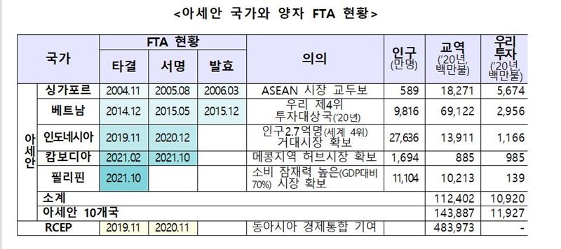 지난 2017년 신남방정책 선언 이후 역내포괄적경제동반자협정(RCEP, 2020년 11월 서명), 인도네시아(2020년 12월 서명) 등에 이어 필리핀, 캄보디아 등 신남방 주요 국가들과의 다자·양자 FTA 네트워크를 완성했다.