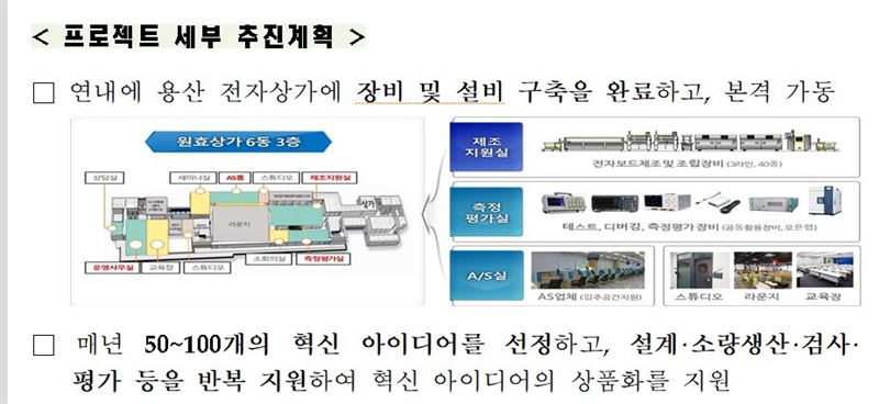 이에 국내 혁신기업들의 아이디어가 적시에 상품화될 수 있도록 용산 전자상가에 '한국형 전자 제조혁신 지원단지'를 구축한다는 계획이다. 도심지역 내 전자부품·유통 등 시설이 이미 집적된 최적의 인프라를 활용함과 동시에 용산 전자상가를 전자 혁신기업 탄생의 전초 기지로 탈바꿈시켜 용산 전자상가의 활력을 제고한다는 방침이다.